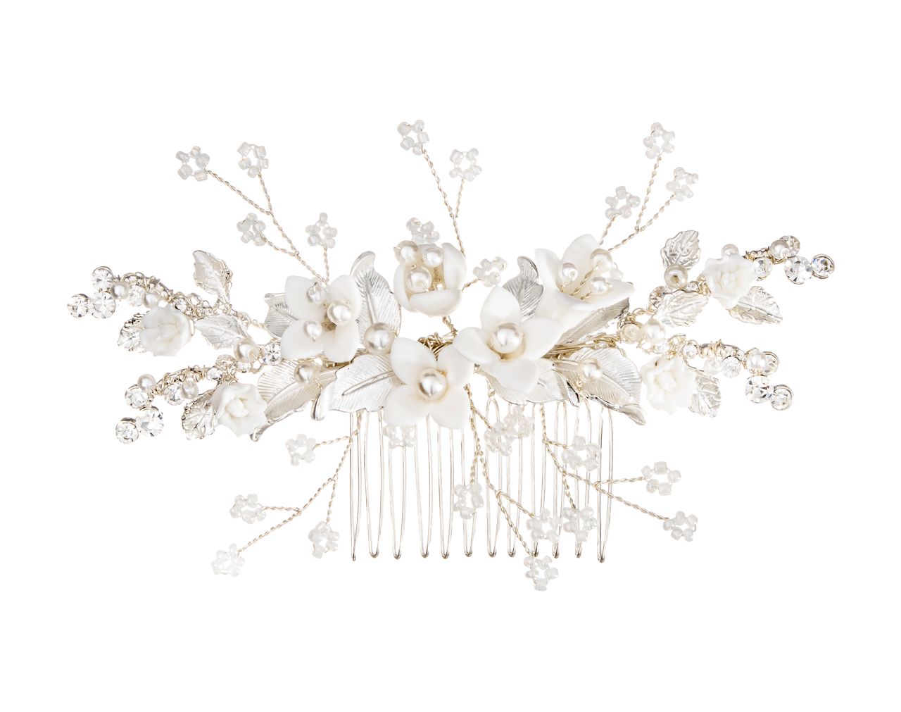 Romantic and elegant handcrafted bridal hair accessory, decorated with ceramic-style white flowers and pearls.