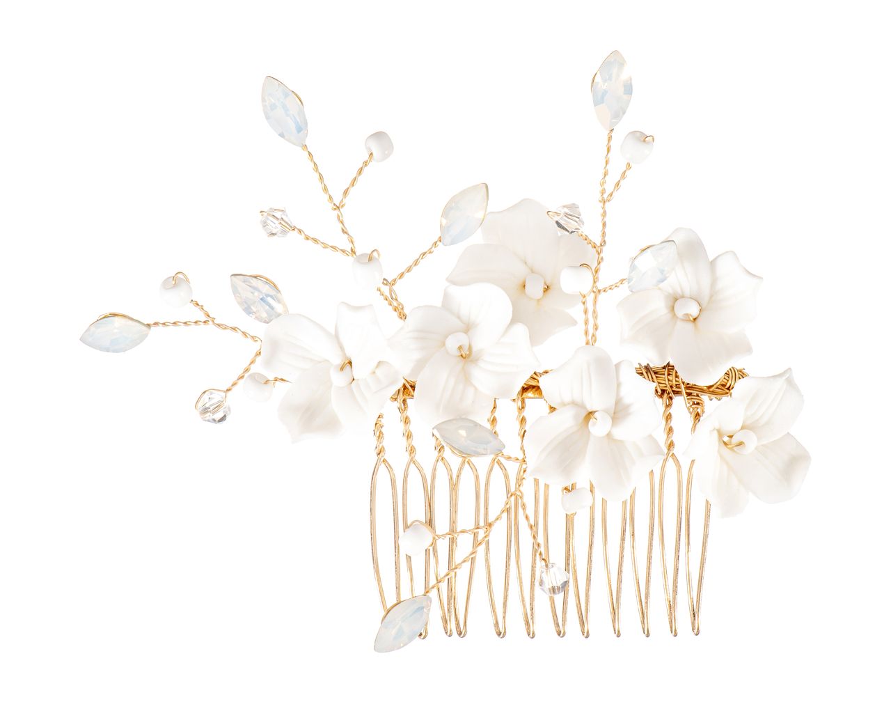 Romantic and elegant handcrafted bridal hair accessory, decorated with ceramic-style white flowers and pearls.