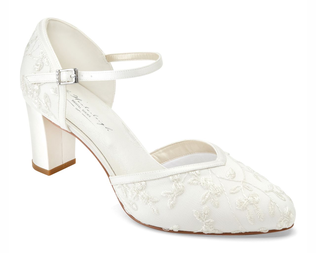Our Indira bridal shoe has been inspired by our bestselling model Miriam. Indira is an exclusive handmade satin shoe with beautiful lace cover. Its mid-height block heels are not only very fashionable, but also comfortable. The adjustable strap keeps the foot stable. The leather insole, the gel padding and the sponge-lining provide maximum comfort.