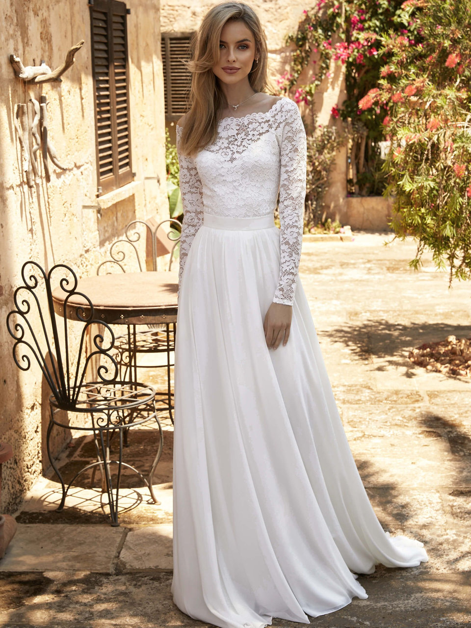 Elegáns csipkéből készült body, hosszú ujjakkal és csónaknyak-kivágással, tökéletes kiegészítője esküvői ruhádnak.